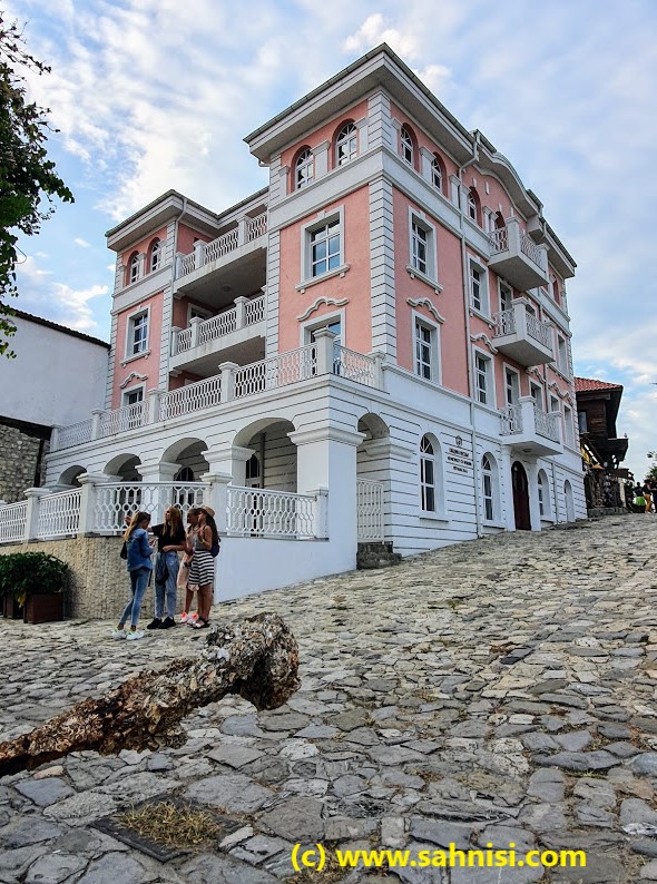 We are closing in on the nicest forms. One of the oldest traditional house in Nessebar is the House of Captain Pavel. But this is subject to a different paper. What I like most is the Town Hall Building near Captain Pavel’s House. It is clearly built later, probably in the 20th century in a questionable eclectic style. However, the plan matches the one of the Pavel’s building and nonetheless, the building is pushed back by a few meters, allowing the viewer to see the old house first. But the facade is symmetrical, composed of three vertical modules, with the outside modules protruding just like the sahnisi’s of the old house. And the bossage of the ground floor matching the stones ground floor of the old house. The City Hall is taller, but by wisely pushing it back, farther from the harbor, the view is not disturbed and the eyes first fall on the historical monument. The newer building simply backs it up.
