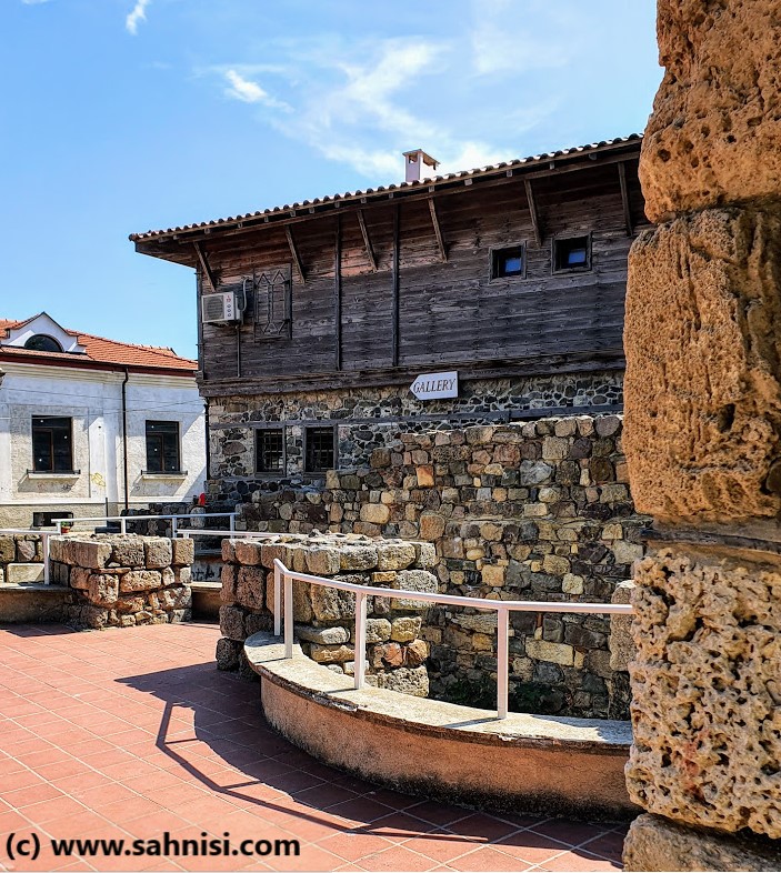 In Nessebar, the tradition means winding streets to stop from allowing the wind to freely cross the city that would produce damaging drifts or simply diminished comfort of living. The streets are narrow to block direct sunlight onto the streets in the scorching summer sun. Then the building follows the traditional Balkan house with protruding second storey that further blocks direct sunlight while enlarging the living space of the family. First floor is used for storage and hence it needs to keep low temperature. It does that by creating just a few narrow openings in a thick stone wall. The second storey typically uses wooden beams instead of regular plaster for facade to protect from the sun, and salt humidity.