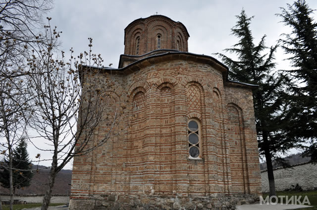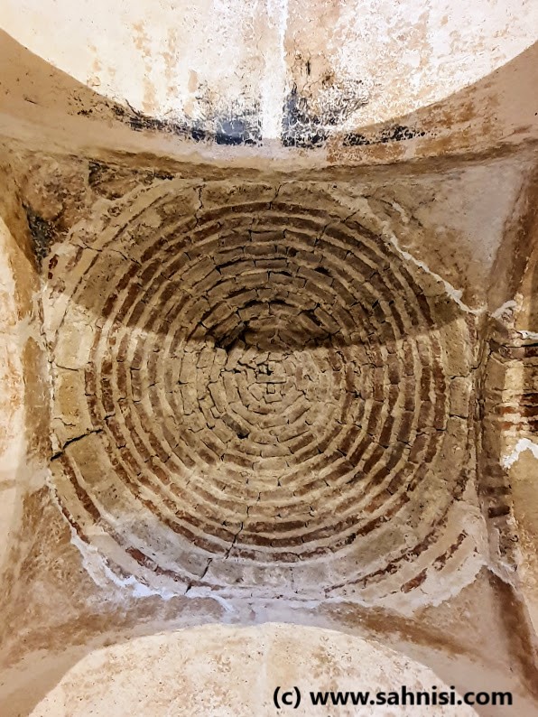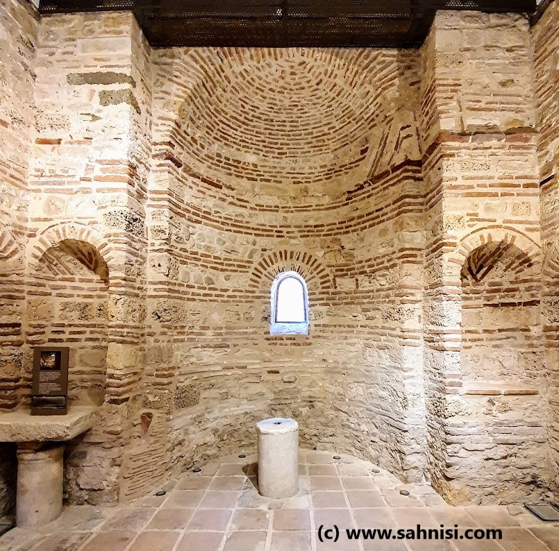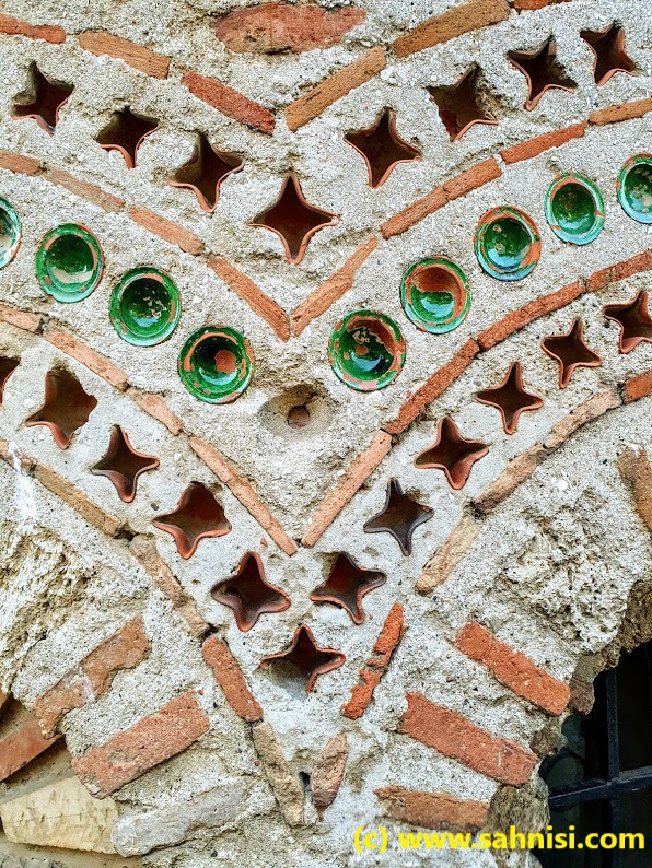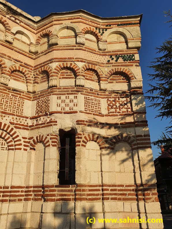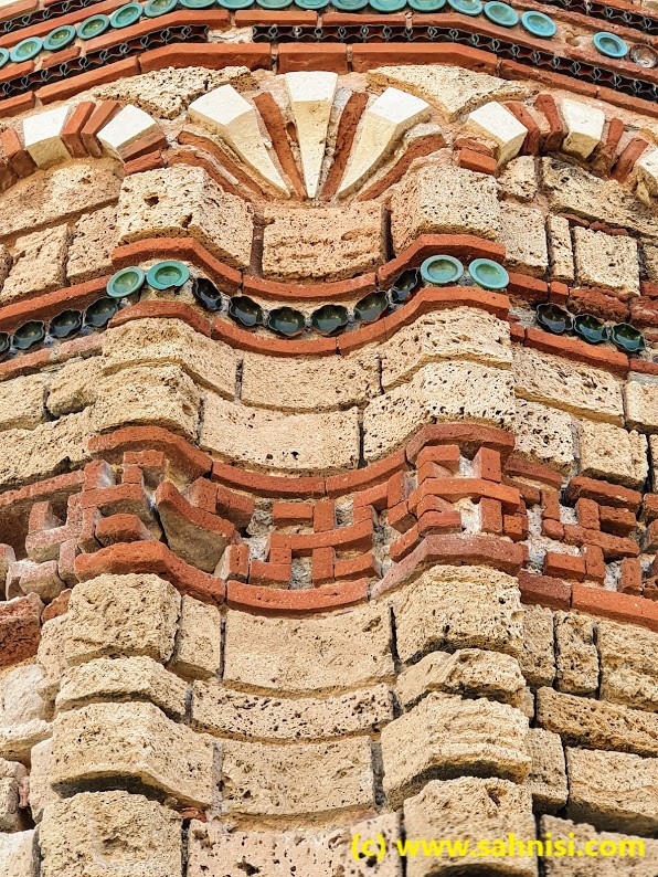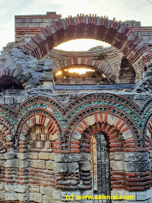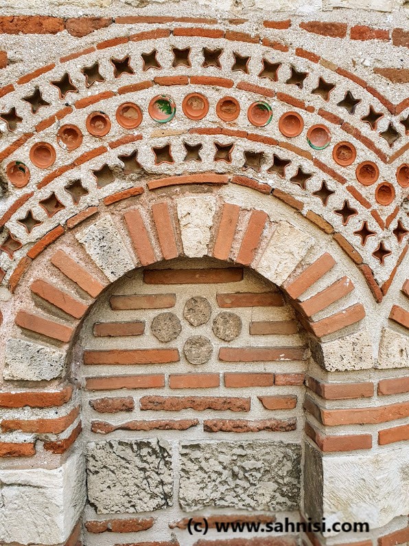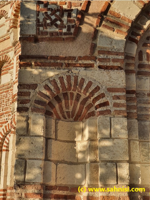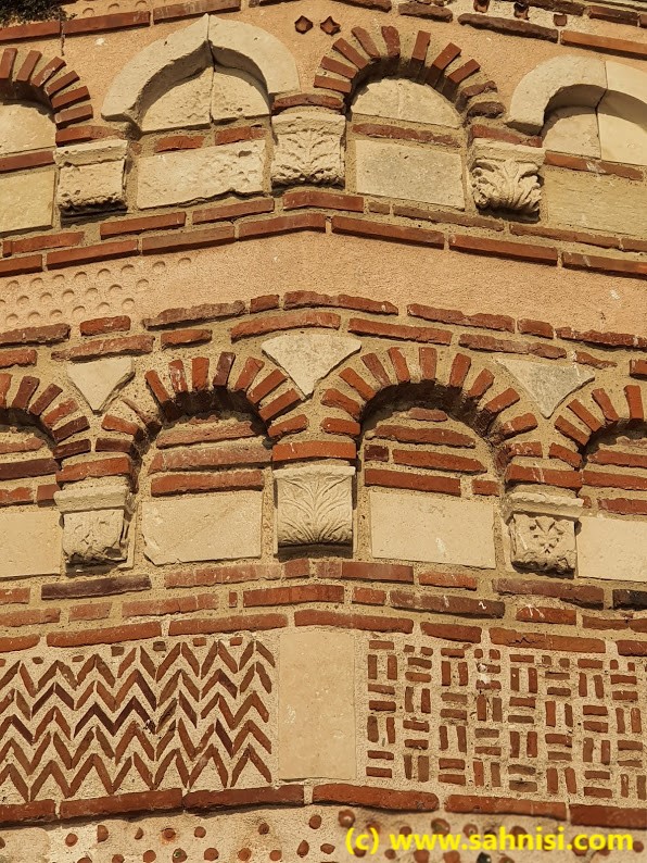 The brick work is somewhat typical for the Early Byzantine days, with an opus mixtum technique with thick limestone bricks, coarsely cut in rectangular shapes, alternating with red brick lines. This creates a nice continuity of the texture and an elegance of the foundation. If one raises the eyes, will notice on the southern facade large semicircular niches delimited by blind arches, sustained on pilasters. There also is a small opening on the eastern side on one of the arcades of central apse (one of three apses on that side). The arcade headings are decorated in checkerboard pattern. The dark squares of the checkerboard are created with two thin brick lines, whose position alternates from vertical to horizontal from one arcade to another. This is the same pattern that can be found in the Church of Saint Nikita in North Macedonia, an influence that will be explained in a later post. The arcades are then surrounded with three rounds of concentric curvilinear frames of colored ceramique. Each one of the three layers consists of repetitive motifs in the order X, O, X. The effect is quite pleasing to the viewer. The opus mixtum alternance as well as the X, O motifs alternance creates harmonious horizontal registers that attenuate the massivity of the monument. On top of naos used to stand a dome, supported by 4 semi-cilindrical vaults, collapsed in the meantime.