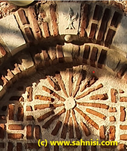 Each large arcade is flat in depth and flanked by two smaller arcades, one semispherical in depth and the other one flat. Both types have multiple concentric voussoirs, consisting of limestone bricks and brick lines. 1 – The large arcade has a sea wave-like pattern. 2 – The large arcade has a quatrefoil symbol of the sun, which is not unusual in the Byzantine world, later widely used in Gothic and Renaissance churches. The diamonds surrounding the sun can call to the rain. The other two smaller arcades have checkerboard patter and a zig-zag pattern. 3 – The large arcade has a radiating sun pattern. Between the large arcades, there are checkerboards or intricated geometrical shapes. 4 – Above the large arcade there is a very nice geometrical motif, almost resembling an Islamic one.