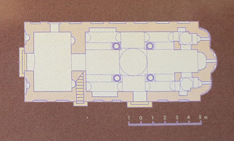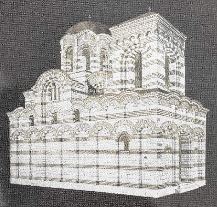 Left – The south view of the Christ the Pantokrator Church (from [3]). Top-right – 3D modelled north view with a reconstructed bell tower above the narthex (from [1]). Bottom-right – The plan of the church (from [1])