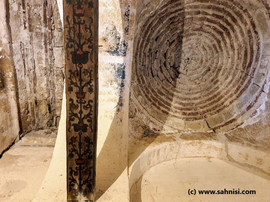 We are moving on to Church of Saint Paraskeva (#BYZ36). While (still) not fully restored, at least it is rennovated and can be visited, even hosting an art gallery. The roof has been lost, as it is now a two-sloped roof, whereas it used to have two domes, one on top of the narthex and a bigger one, on top of the naos. Of these two, the visitor will only be rewarded with the former dome, which is pretty impressive to analyze nonetheless. First of all, the dome is not supported by pendentives. Instead, a small adapter form, called trompe d’angle, is used to adapt the circular dome to a square. Four such trompes are used in each corner of the square. Then four big arches support the dome. Whereas by usign a pendentive, the size of the arches is dictated by the size of the dome itself (rather small), by employing such a technique the builder is able to widen the area and the size of the arches. But that is only half of the story unfurled by this petite dome. The two arches (northern and southern) are supported by two wooden beams. They are decorated with vegetable motifs that most likely date back in the Ottoman period, some centuries after the church was built. The style of painting ressembles the Mughal calico patterns or the Tokat style printing style, established in the Ottoman decorations throughout the entire existence of the Ottoman Empire, bearing influences from the Middle East and from India. Last but not least, one should notice the minimalist cross at the tip of the dome.