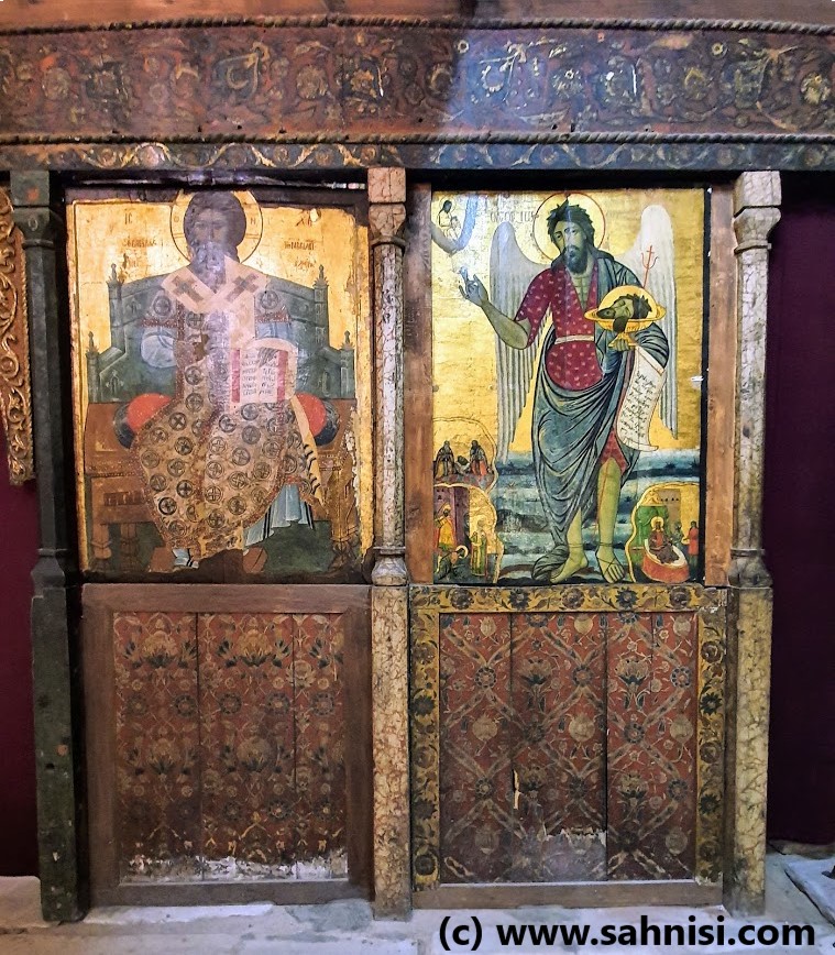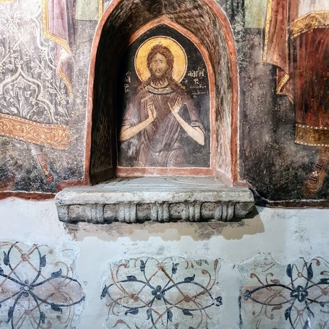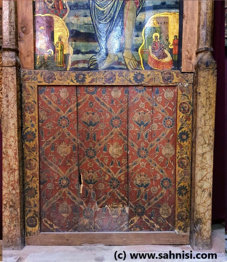 As we near the altar, we cannot ignore the beautiful iconostasis, painted in wood that embellishes the altar. The paintings date back from the 16th century, when Nessebar was obviously under Ottoman occupation. There is the same influence that we saw from the St. Paraskeva’s church, hinting to Tokap style or Mughal calico. The pattern is a rhythmic, rounded vegetable pattern, with flowers, tulips among them, hinting to the Tulip Era of the later 18th century during the reign of Ahmed III (1703-1730), when architecture and particularly the decorations blossomed ”in preparation” for the later Ottoman Baroque. A special note on the twisted rope motif which calls to an omnipresent symbol in the Balkans, a symbol of unity in faith and religion, which later can be transposed in a unity of the people.