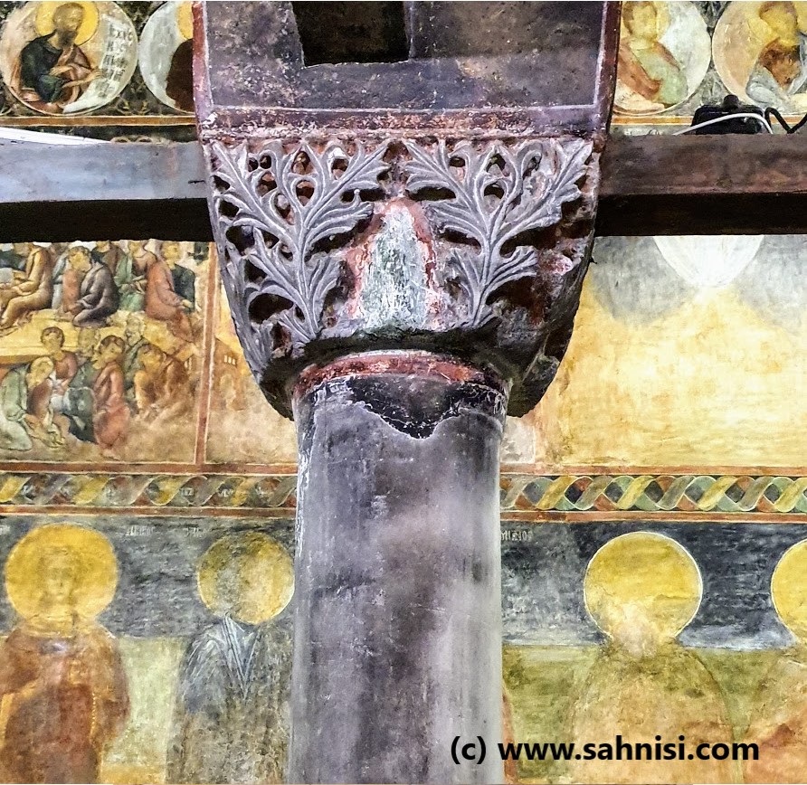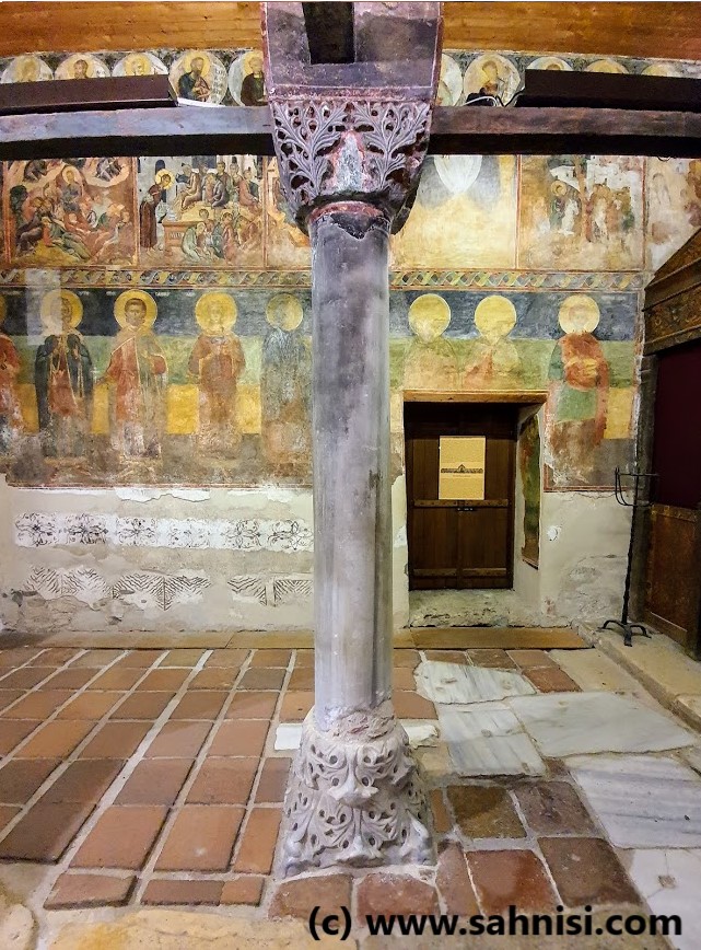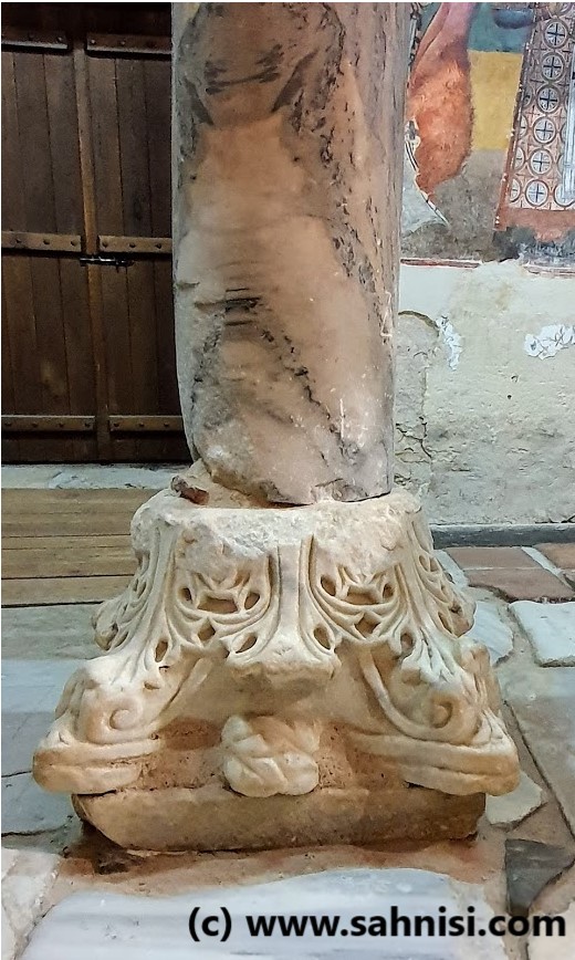The interior is the most spectacular one, especially for an ecclesiastical art lover. The naos is divided in the threeaisles by rectangular columns describing an arcade at the west side, but in the front, two beautiful marble columns stand in front of the altar. As a curiosity, the columns have reversed capitals as a base, rich with deeply carved acanthus leaves. It is not clear to me whether these marble blocks or columns were crafted especially for this building or brought from another site that was dismantled.