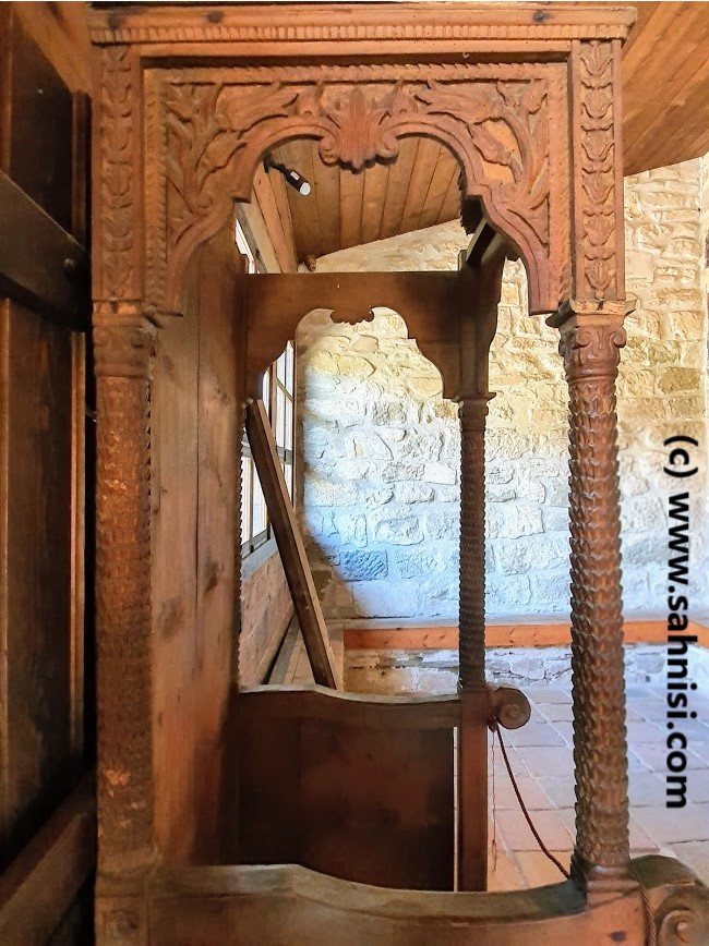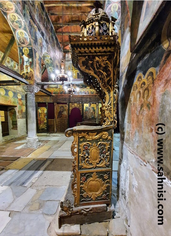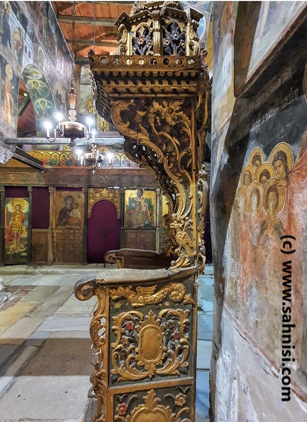 The Bishop throne and the pulpit, both beautifully carved in wood, originating from 18c. Left – The Bishop throne in its entirety, showing the wooden lions on which the throne is supported. Middle – Close-up of the Bishop throne. Vegetable and zoomorphic symbols (griffins, peacocks, dragons). Right – the richly ornated pulpit/amvon with stairs.