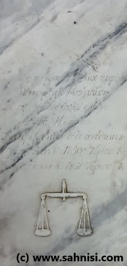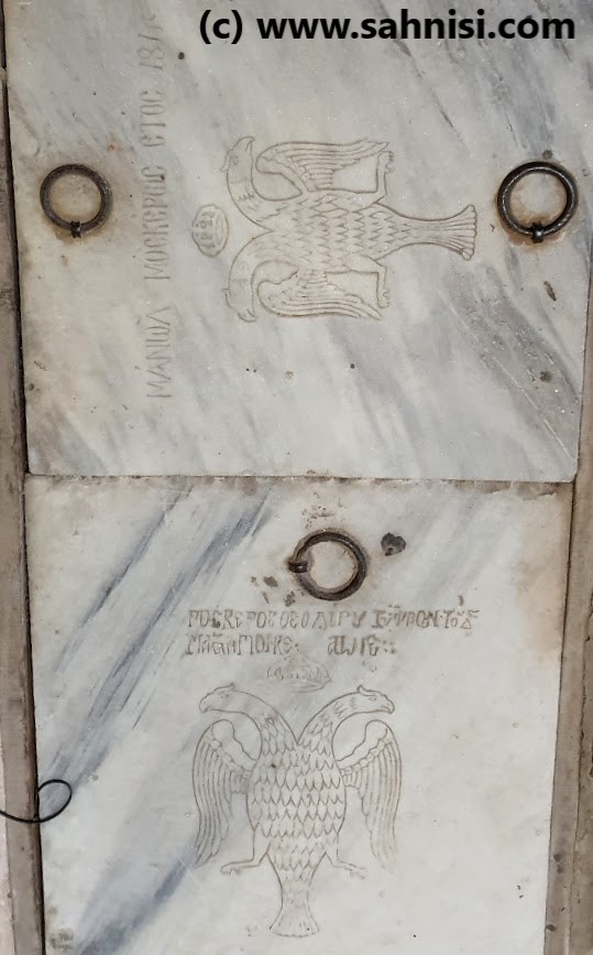Also noticeable are the marble floor tiles. There is a marble grave slab of a Greek local as well as two other marble tiles showing the Byzantine coat of arms, also used for graves. These derive from the 19th century.